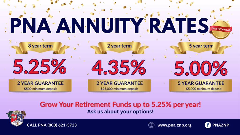 Are you worried about market volatility affecting your retirement savings? The Polish National Alliance has a solution. Our new, high rates on annuity accounts offer a safe and secure way to save for retirement, with the potential to earn up to 5.25%. Choose one of three PNA Annuity accounts. Let our Annuity Department answer all the questions you may have. Decide which annuity account is the one for you and start building your retirement!